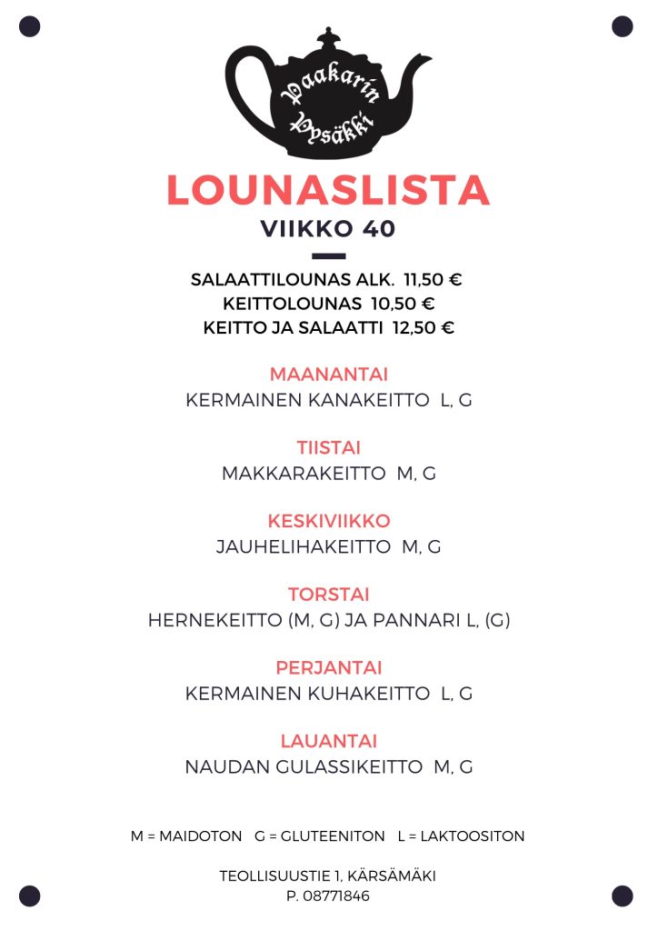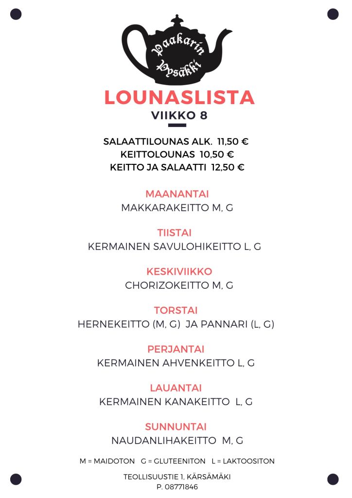 Tervetuloa Paakarin Pysäkille, jossa jokaiselle löytyy suolaista tai makeaa mahan töydeltä! Meiltä löydät tuoreet leivonnaiset ja oman leipomon tuotteet, sekä päivittäin vaihtuvan herkullisen keittolounaan. Kahvilastamme löydät ihanan valikoiman lahjoja ja tuliaisia vieraille tai kotiinviemiseksi.