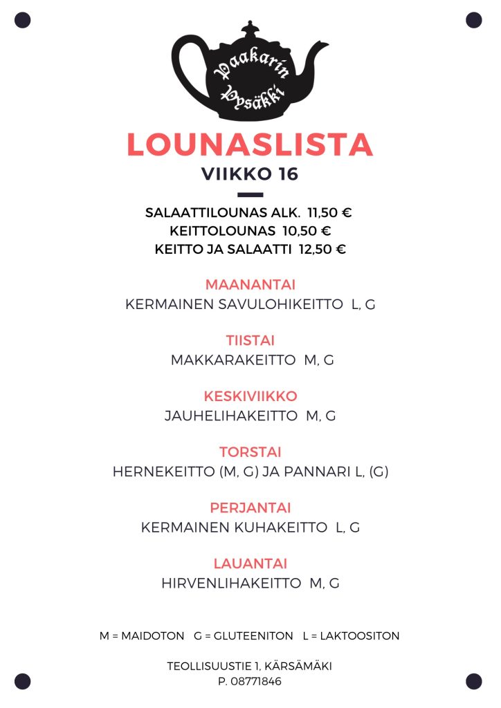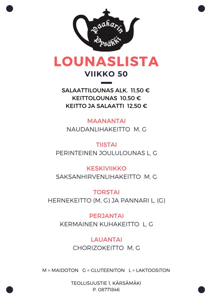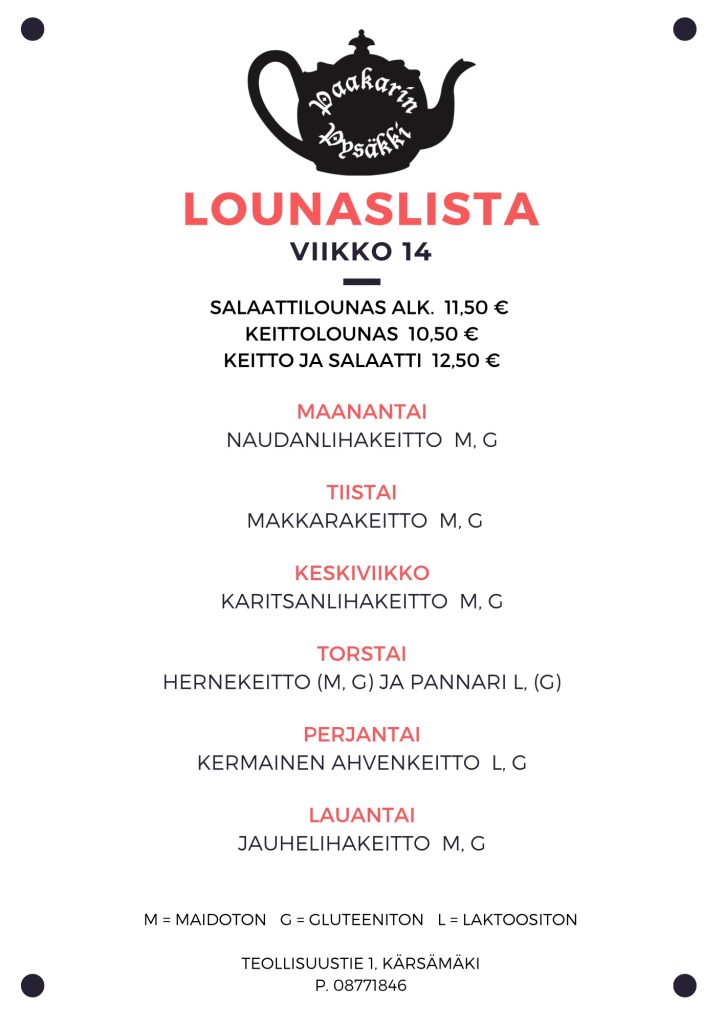 Tervetuloa Paakarin Pysäkille, jossa jokaiselle löytyy suolaista tai makeaa mahan töydeltä! Meiltä löydät tuoreet leivonnaiset ja oman leipomon tuotteet, sekä päivittäin vaihtuvan herkullisen keittolounaan. Kahvilastamme löydät ihanan valikoiman lahjoja ja tuliaisia vieraille tai kotiinviemiseksi.